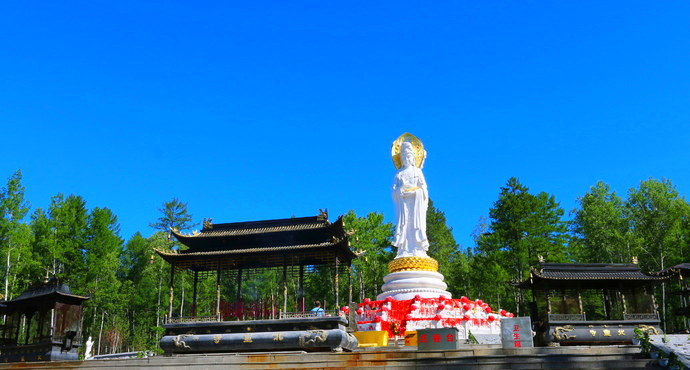 觀音山位于漠河縣207省道,是漠河觀光游覽的勝地。這里山勢(shì)舒緩,山形俊秀。觀音像為三面,三位觀音菩薩持著不同法器,一為持經(jīng)篋,一為持念珠,一為持蓮花,展現(xiàn)了觀音大士的不同化身。觀音法身有10.8米之高,端莊肅穆,威嚴(yán)大氣,座北朝南,海南南山海上觀音座南朝北,南北相望,遙相呼應(yīng)。特別是當(dāng)北極星最亮之時(shí),正好處在佛像上方,預(yù)示著佛光普照,國(guó)泰民安。